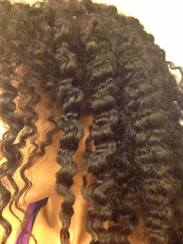 When I rinsed it out, I got a surprise...stiff, not soft hair! Of course, this isn't how your hair should feel after a good DC. I didn't think there was any protein in the coconut milk, but there was protein somewhere in that concoction because my hair felt like I'd just given myself a protein treatment! No problem, I thought. Since my hair is more porous in the front and at the crown, a little more protein was not a bad thing. So I applied a moisturizing conditioner and rinsed before getting out of the shower. (After a protein treatment, always always ALWAYS apply a moisturizing conditioner/deep conditioner, depending on how intensive the protein treatment.)
